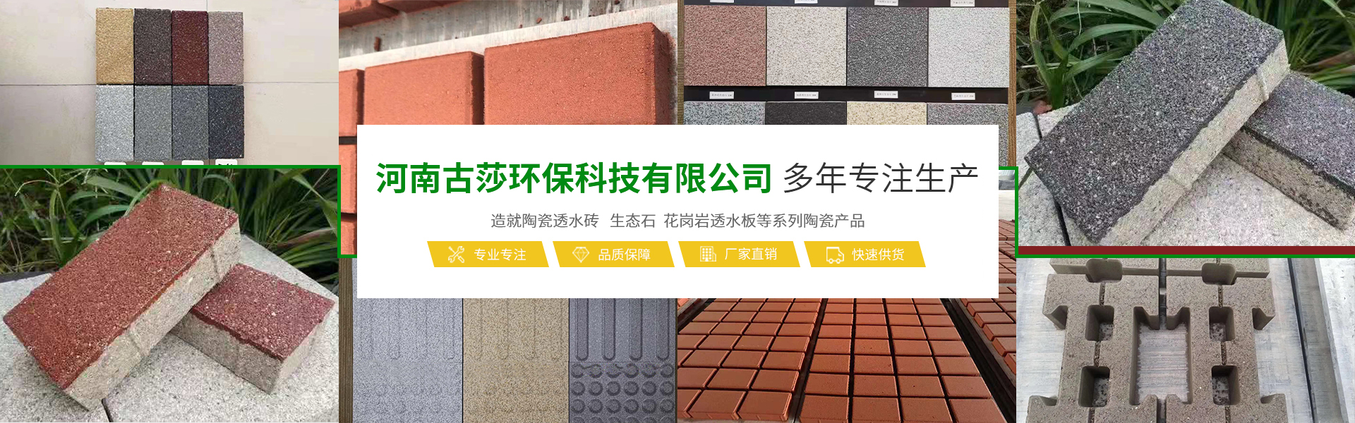 河南古莎環??萍加邢薰究傋溆诮煌屑~城市鄭州,是一家具備研發、生產、銷售能力為一體的綜合性現代化陶瓷企業。本公司專業生產經營生態陶瓷透水磚、生態鋪石、PC仿石材透水磚、PC仿石材景墻磚、普通透水磚、燒結磚等系列產品,完善的研發團隊,完善的生產流水線設備,打造完善的陶瓷企業。古莎環保科技現代化陶瓷企業是美化城市,改善生活環境質量的生態環保產品,可廣泛應用于公共建筑廣場、城市道路、公園、藝術景觀、廊道、房地產、別墅住宅小區、地鐵口、車站、高速公路服務區等。古莎環保科技在原有陶瓷企業基礎上,另拓展園林綠化、市政施工、瀝青包工包料施工、公路維修等業務板塊,專業培訓了一些園林綠化、市政施工技術人員,并有多年的施工養護經驗以及建筑工程經驗。保證市政工程施工質量以及園林綠化后期養護規范化、專業化。古莎環??萍妓裱钠髽I與品牌發展思路,是奠定在品質與產品應用之上。環保理念由我們共同倡導,理性思考,以推進步,感性溝通,以共建優越。古莎環保科技與大家真誠合作,攜手共進,為助力海綿城市建設,建筑高品質的綠色城市生活貢獻一份力量!